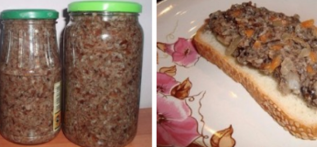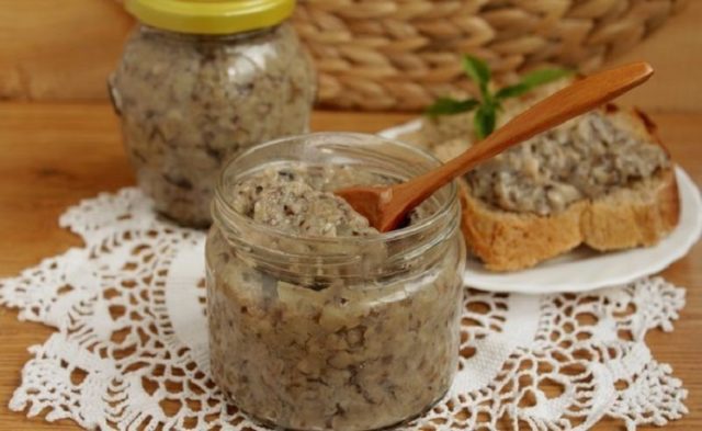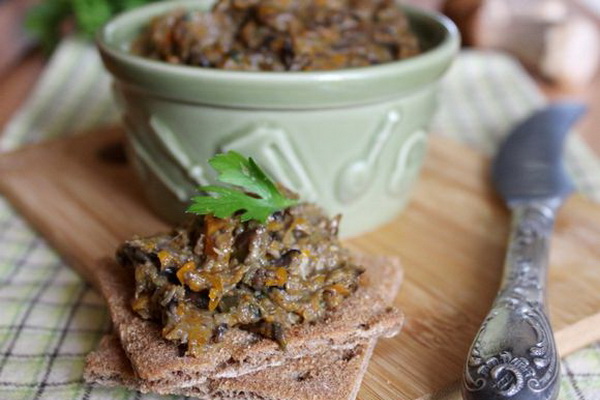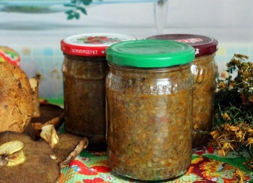Houby se krájí na mlýnku na maso nebo v kuchyňském robotu a cibule se smaží do zlatova. Přidává se do nich hořčice, sůl a suché provensálské bylinky. Výsledná směs se dále dusí po dobu 10 minut a položí se do skleněných nádob. Sterilizují se v široké pánvi po dobu půl hodiny, poté se do každé z nich přidá 1-2 lžíce. l. rostlinný olej. Banky jsou srolovány pod víčky a odeslány k uskladnění.