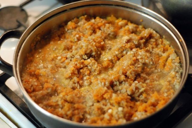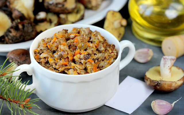 Houby se smaží na středním ohni do zlatova. Zároveň se mrkev, paprika a oloupaná rajčata smaží na jiné pánvi. Poté, co je zelenina vařena, je umístěna do kuchyňského robotu a nasekána s houbami, dokud není hladká. Do výsledné směsi přidejte vařenou rýži a trochu soli. Miska se dusí po dobu 5-10 minut na mírném ohni, ochladí se a podává se.