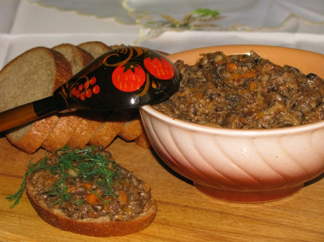 Cibule se naseká a smaží na oleji do měkka.Vařte máslo po dobu 20 minut a rozemlejte je na mlýnku na maso se smaženou cibulkou. Výsledná houbová směs je solená a smíchaná s nasekanými bylinkami. Vařený kaviár se několik minut dusí na mírném ohni, ochladí se a podává k večeři.