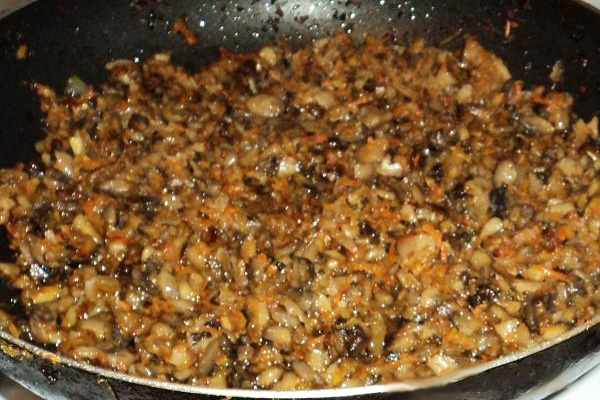 Cibuli a mrkev oloupeme a nakrájíme na malé kostky. Jsou smažené s vařenými houbami, dokud nejsou vařené. Poté jsou všechny ingredience rozemleté v mlýnku na maso. Hotovou směs dochuťte mletým pepřem, solí podle chuti a poté smažte dalších 10 minut.