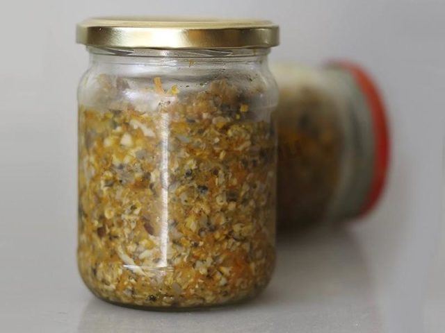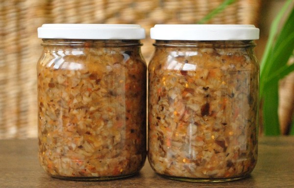 Stejně jako ve všech ostatních receptech je máslo smažené do měkka s nakrájenou cibulí. Jsou rozemleté v kuchyňském robotu a solené. Výsledná směs se dá na pomalý oheň, nalije se do ní na několik kousků nakrájený ocet a česnek. Hotový výrobek se umístí do sterilizovaných skleněných nádob. Každý přidejte 2 polévkové lžíce. l. oleje a ucpejte je nylonovými čepičkami.